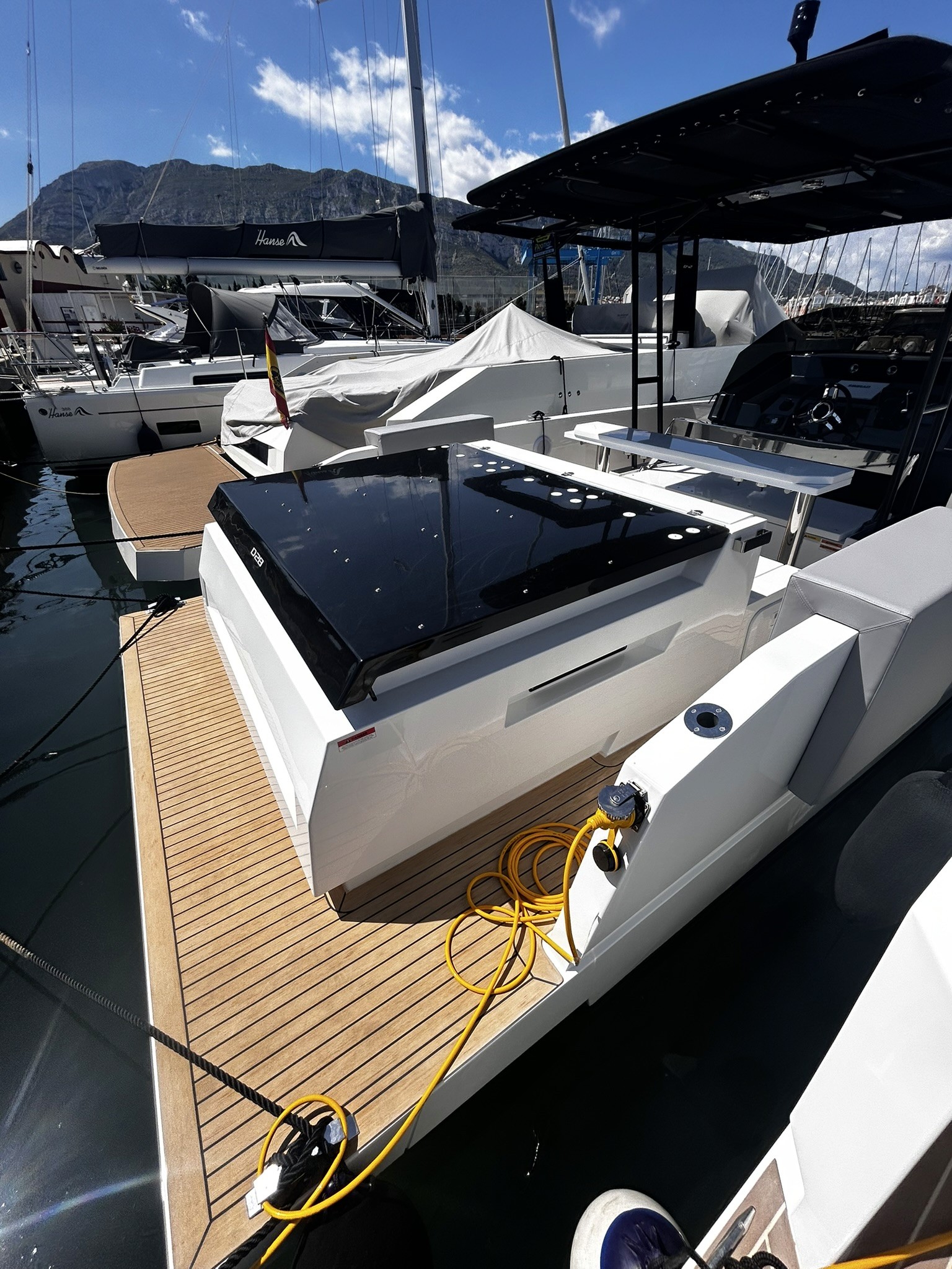 La distribución de los volúmenes permite una cómoda circulación periférica siguiendo el concepto «walk-around». El D28 tiene toda la cubierta al mismo nivel ofreciendo diferentes zonas de solárium con asientos y mesas tanto a proa como a popa. El alto nivel de aprovechamiento del espacio es una sensación incomparable, con una capacidad máxima de hasta diez personas, el D28 es el barco de día ideal.