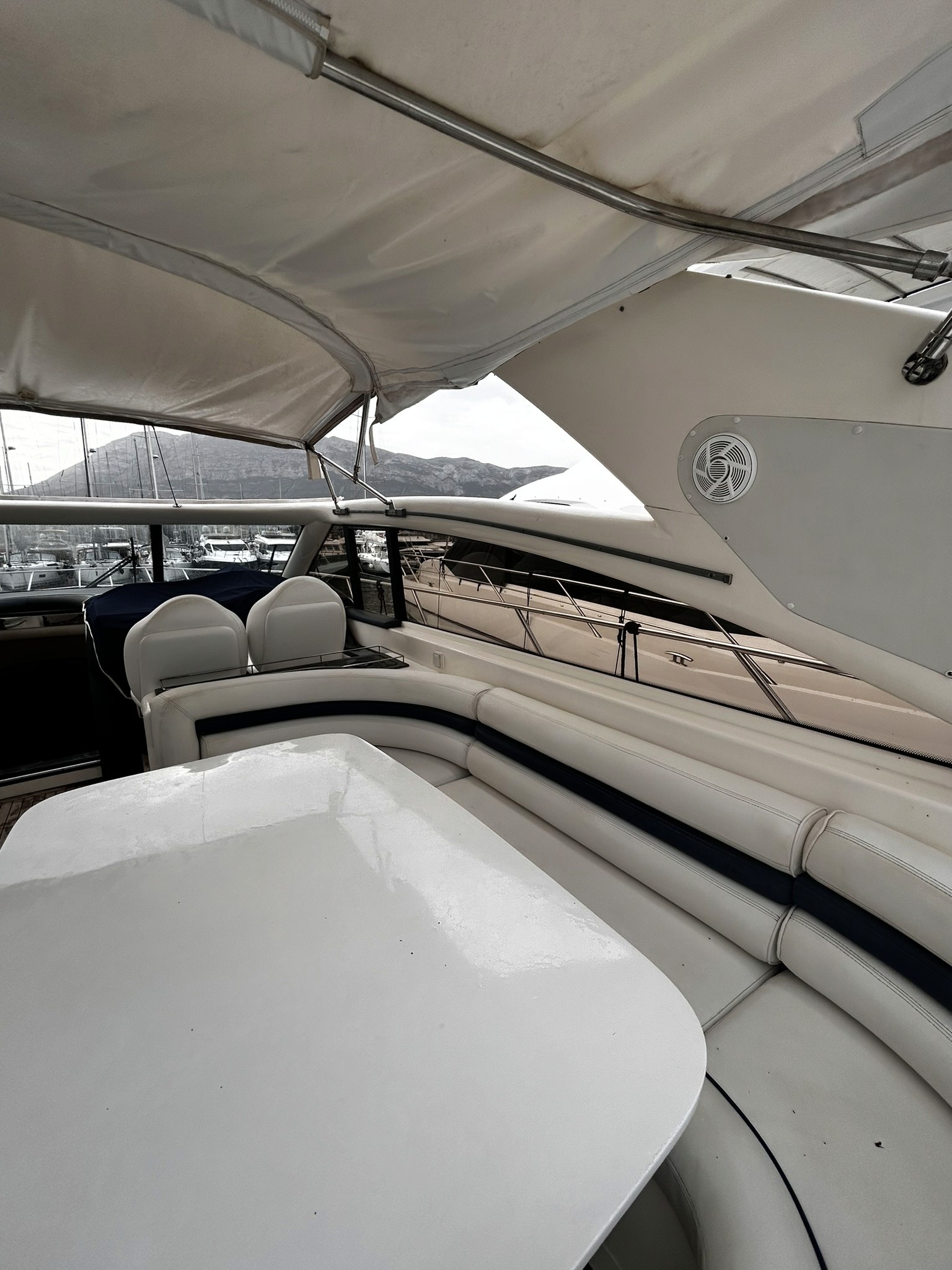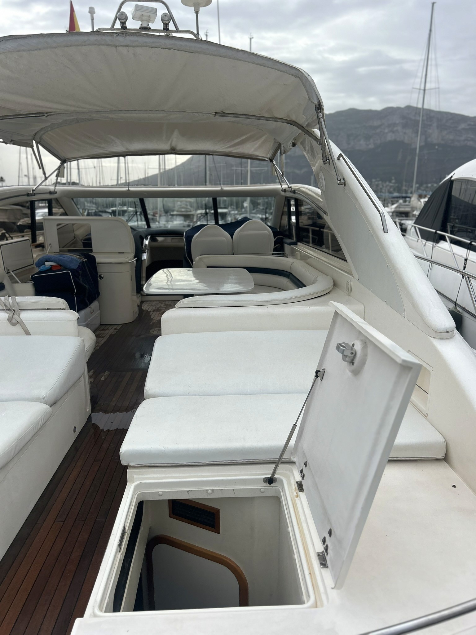 Puente: Una cabina espaciosa con asientos de cuero, una mesa de comedor exterior y una zona de sol en la parte trasera